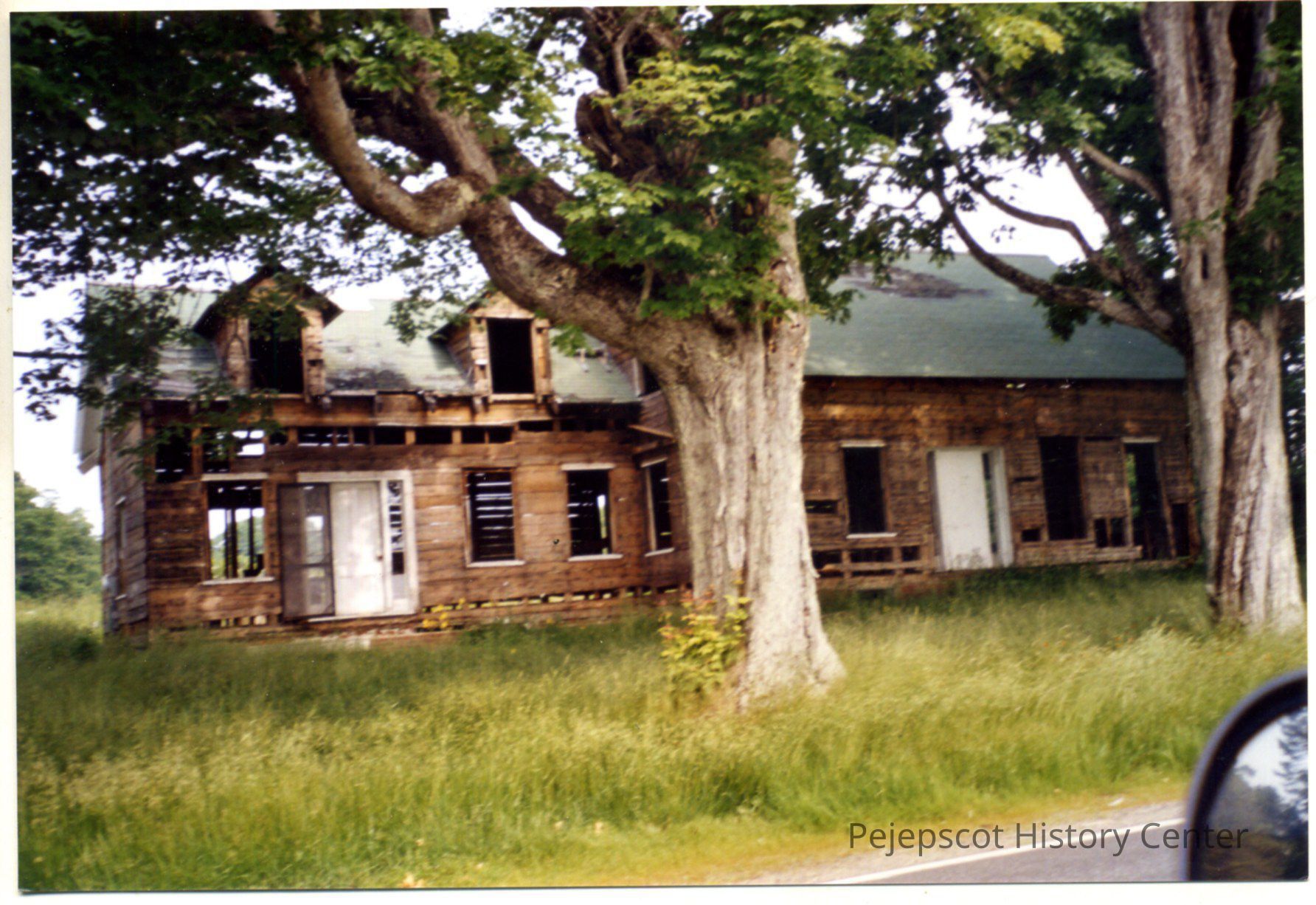 The photo shows large trees in front of an abandoned house on Route 123 in Harpswell Center. The windows are missing, a former ell and barn are gone, as is the porch on the smaller portion of the house at left.