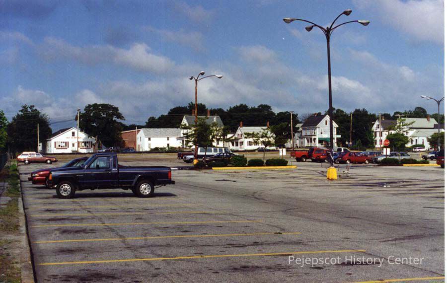 A color photograph of the former site of Grand City. Stores and houses in the background on Union Street. 1994