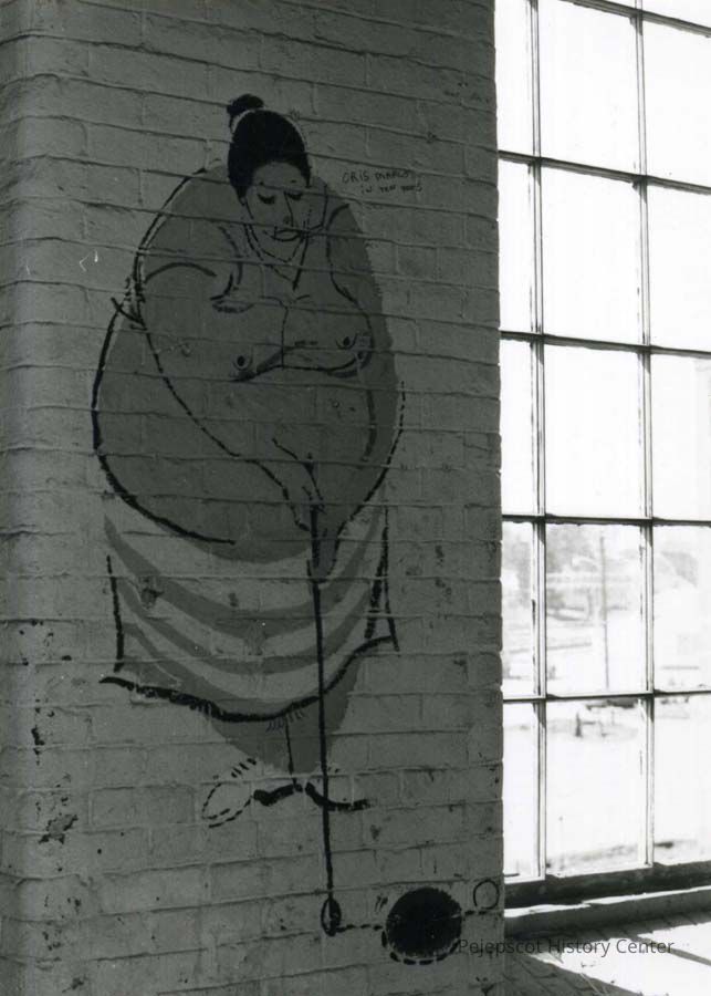 A B/W photograph of the interior of Fort Andross (Cabot Mill) showing a mural of a person playing golf. 4/1987