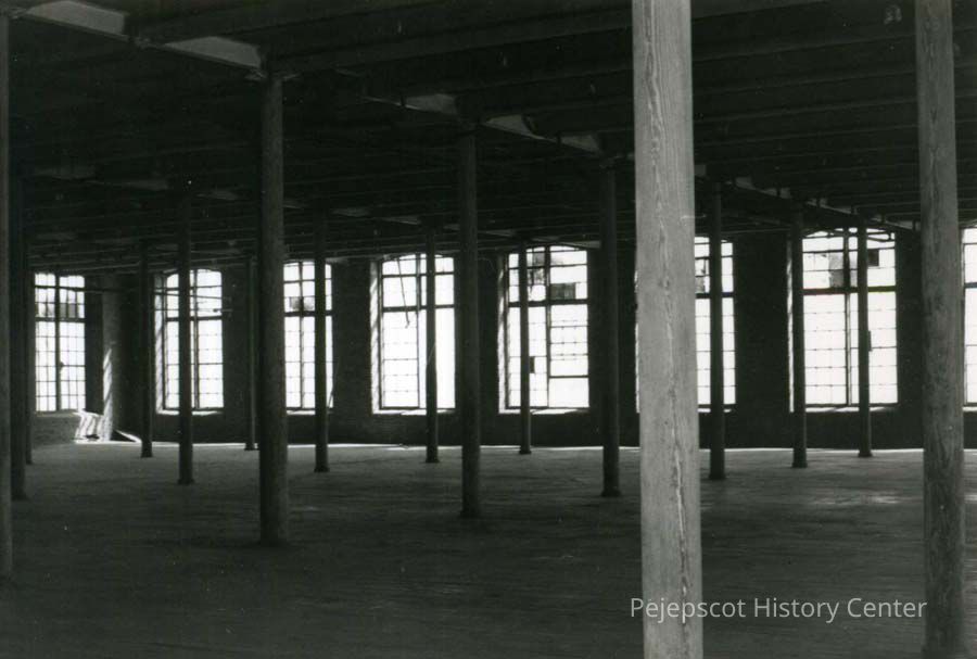 A B/W photograph of an interior scene at Fort Andross (Cabot MIll). 4/1987