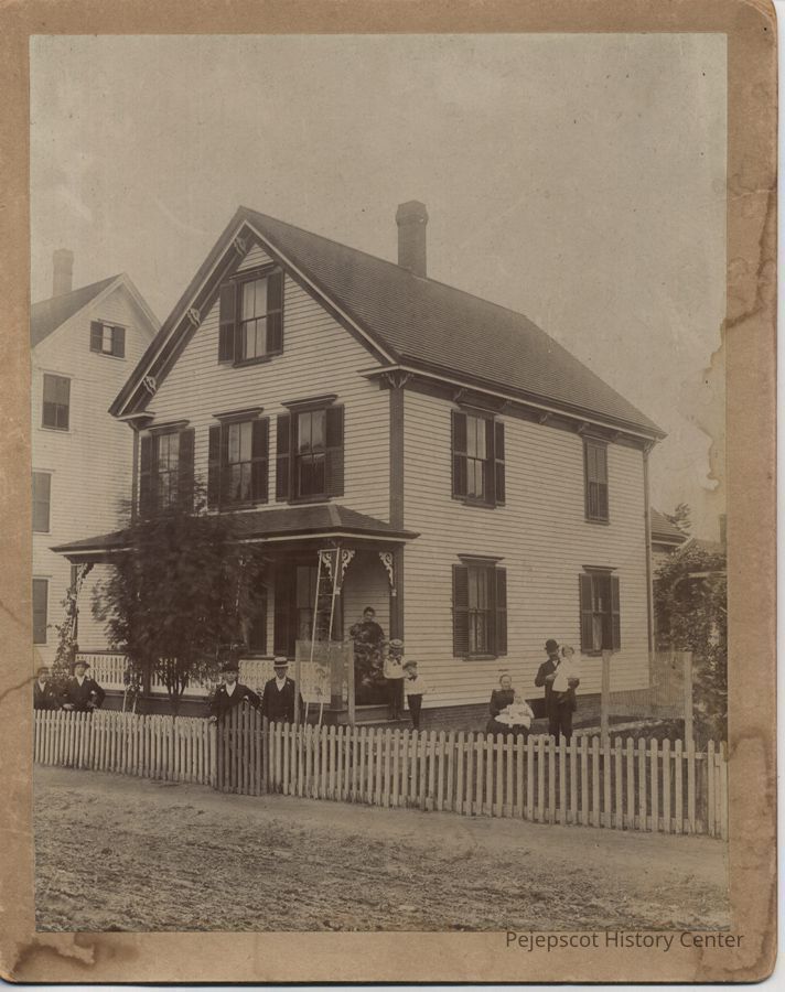Photo of the Fortin Family and their residence at 6 Oak St, Brunswick, Maine, around 1890.