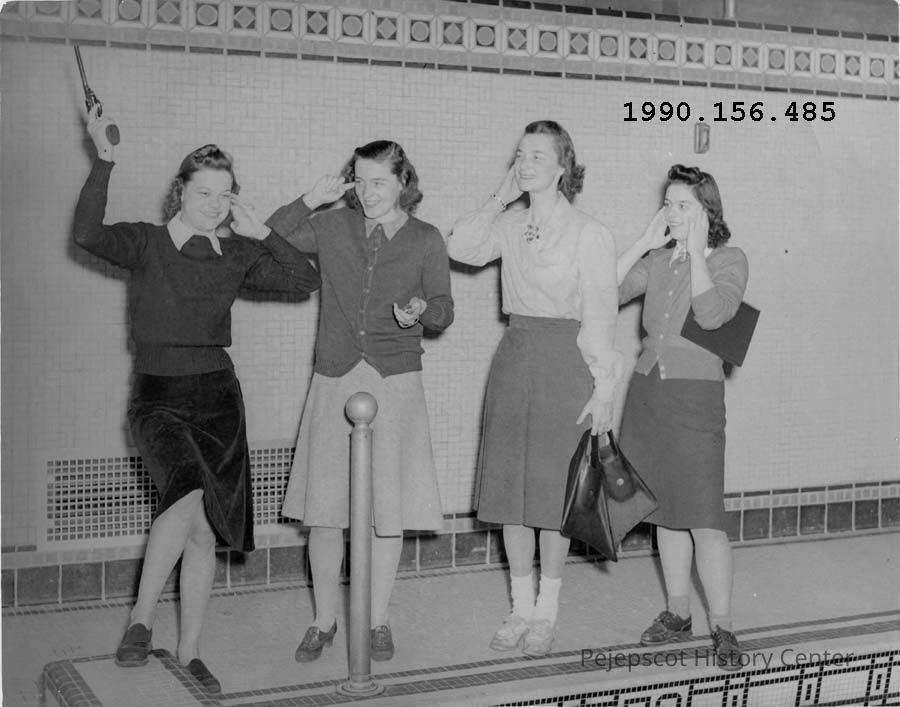 A B/W photograph of four high school girls at the Bowdoin pool. L to R: Mary Gagnon (York); Katherine Martin; Doris Holbrook (Warren-Allen ); Marguerite Martin. c. 1934