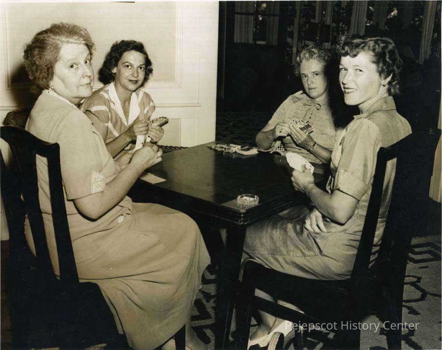 A B/W photographic view of four ladies playing cards. Those identified are Mrs. Edgar Catlin, Ruth Roberts Tucker and Anne Riley. Note the ash tray on the table. Undated