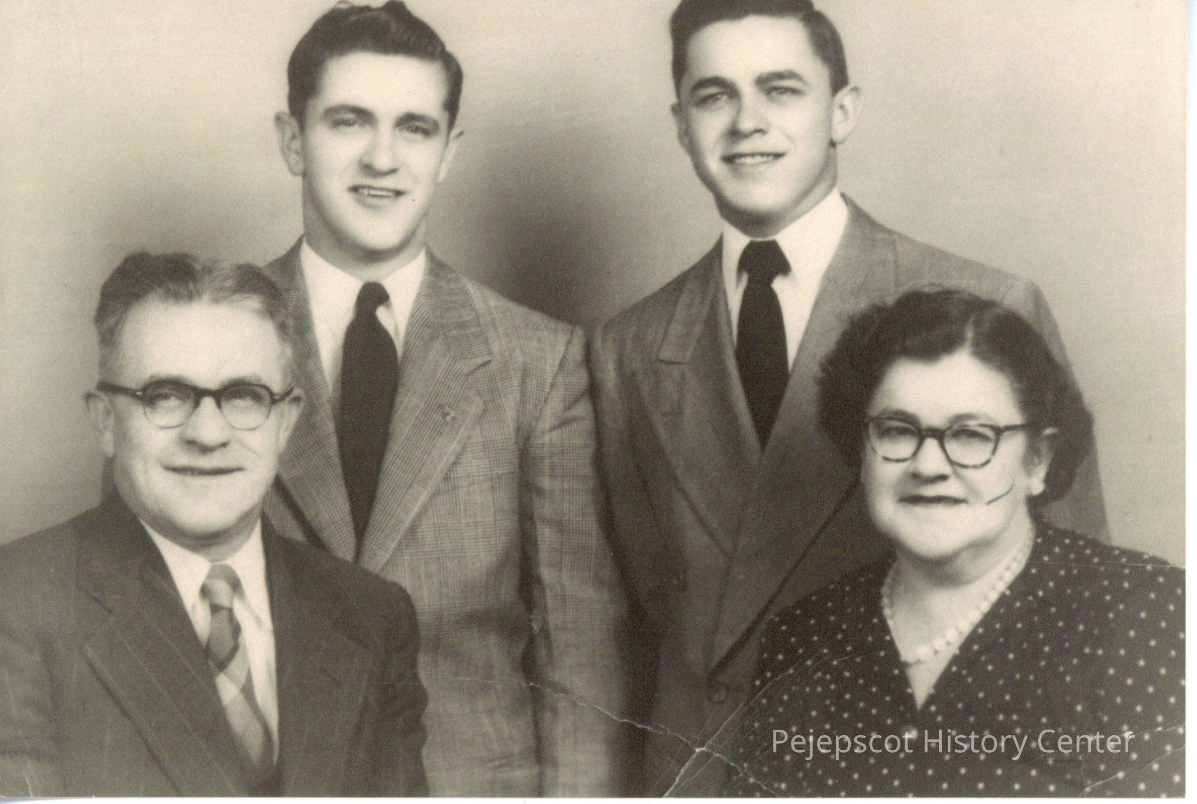 Black and white photo of Paradis Family. Left to right: Edward Paradis, Maurice Paradis, Robert Paradis, Agatha Racine Paradis. Men are dressed in suits while Agatha wears a dress and string of pearls.Collection