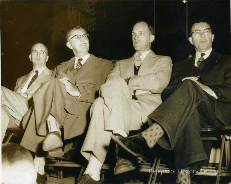 A B/W sepia photograph of four men. One is unidentified and the others are Max Sawyer, Merle Goff and Danforth McFadden. Undated