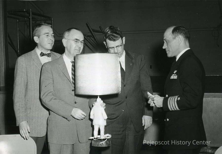 A B/W photograph of four men. They are Thomas Riley Jr., Robert Pomeroy (holding the lamp), Raymond Campbell and a Captain from BNAS. Undated