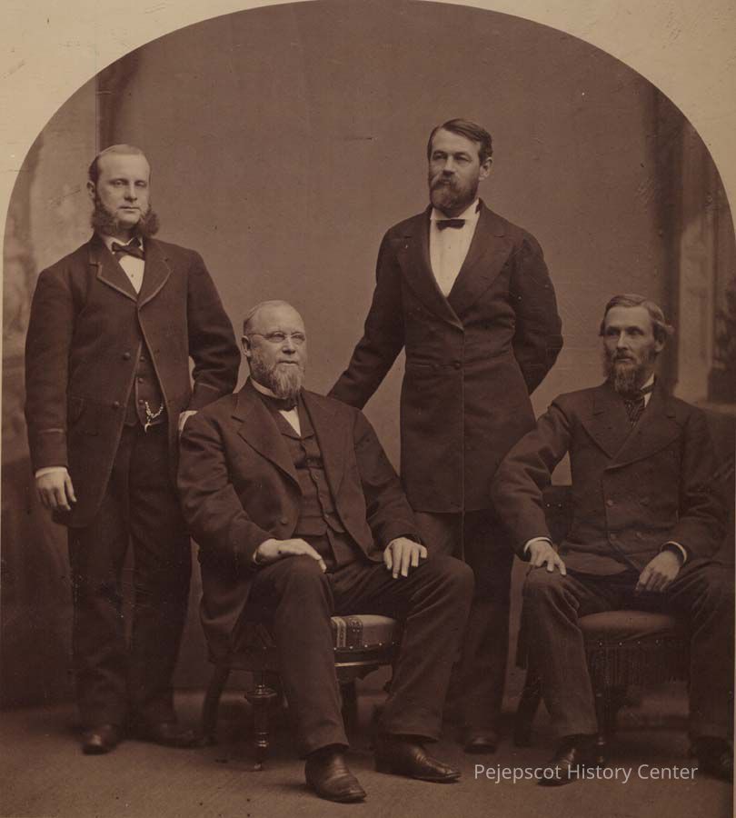 A B/W photograph of E. W. Dennison, Albert Metcalf, Henry Hawks and H. B. Dennison of the Dennison Company. Undated