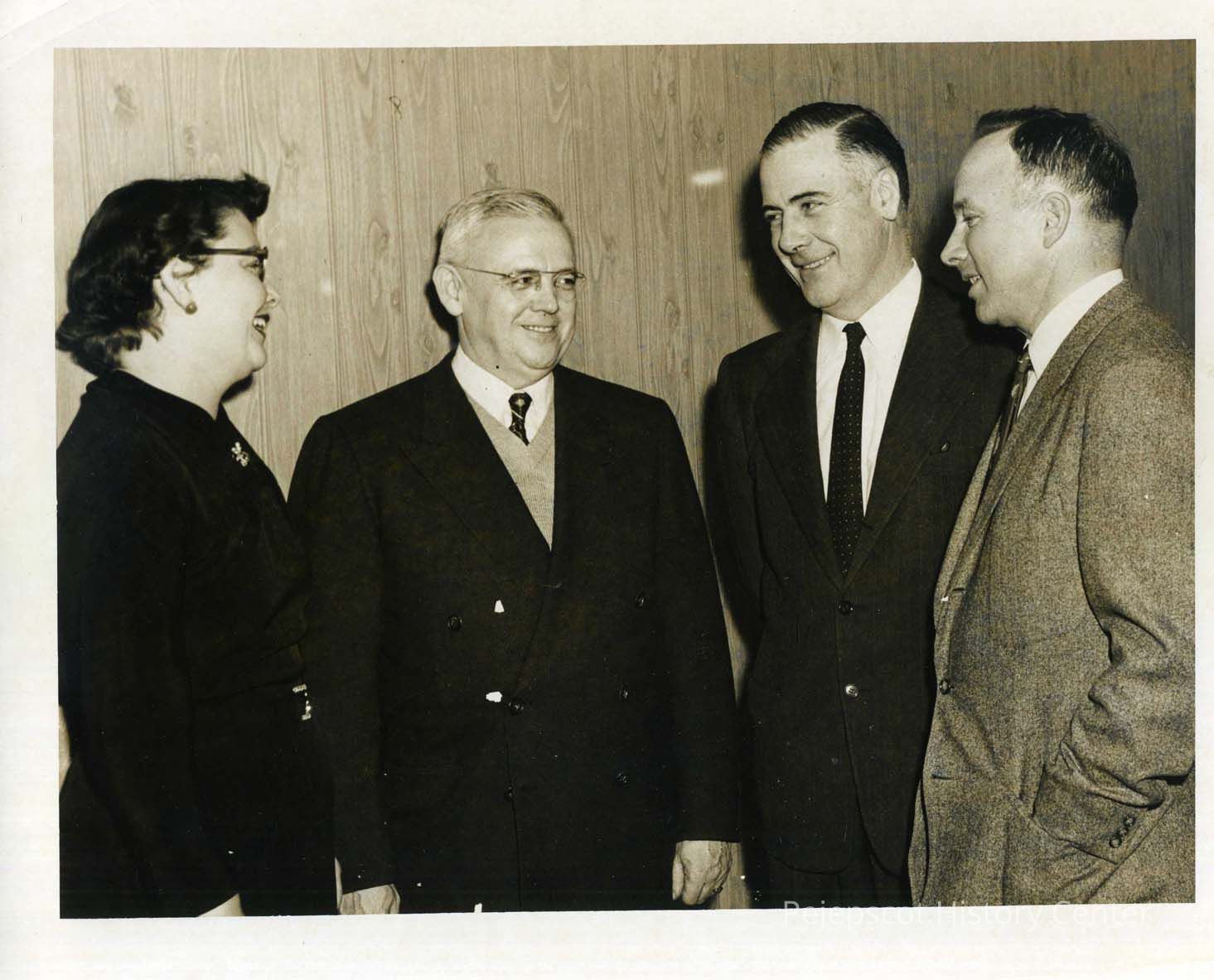 Chamber of Commerce. A photo of four people standing in a semi-circle. They include Mrs. Merle Norton, D. G. Laym, James Black, and G. Coleman. Undated
