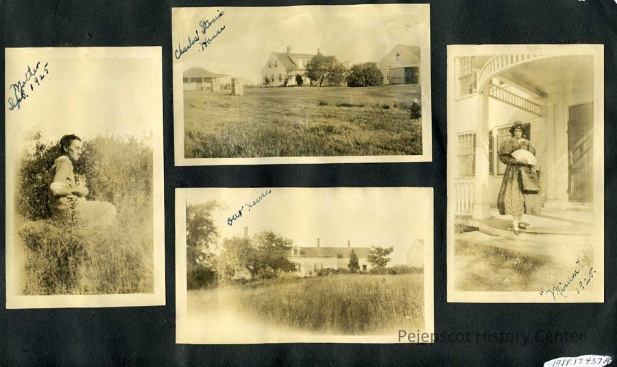 Four black and white photographs from a page of the scrap book of Miriam Stover Thomas. The photographs are labeled (clockwise from left): "Mother Sept. 1925", "Charles Stover's House", "'Miriam' 1925", and "Our House".