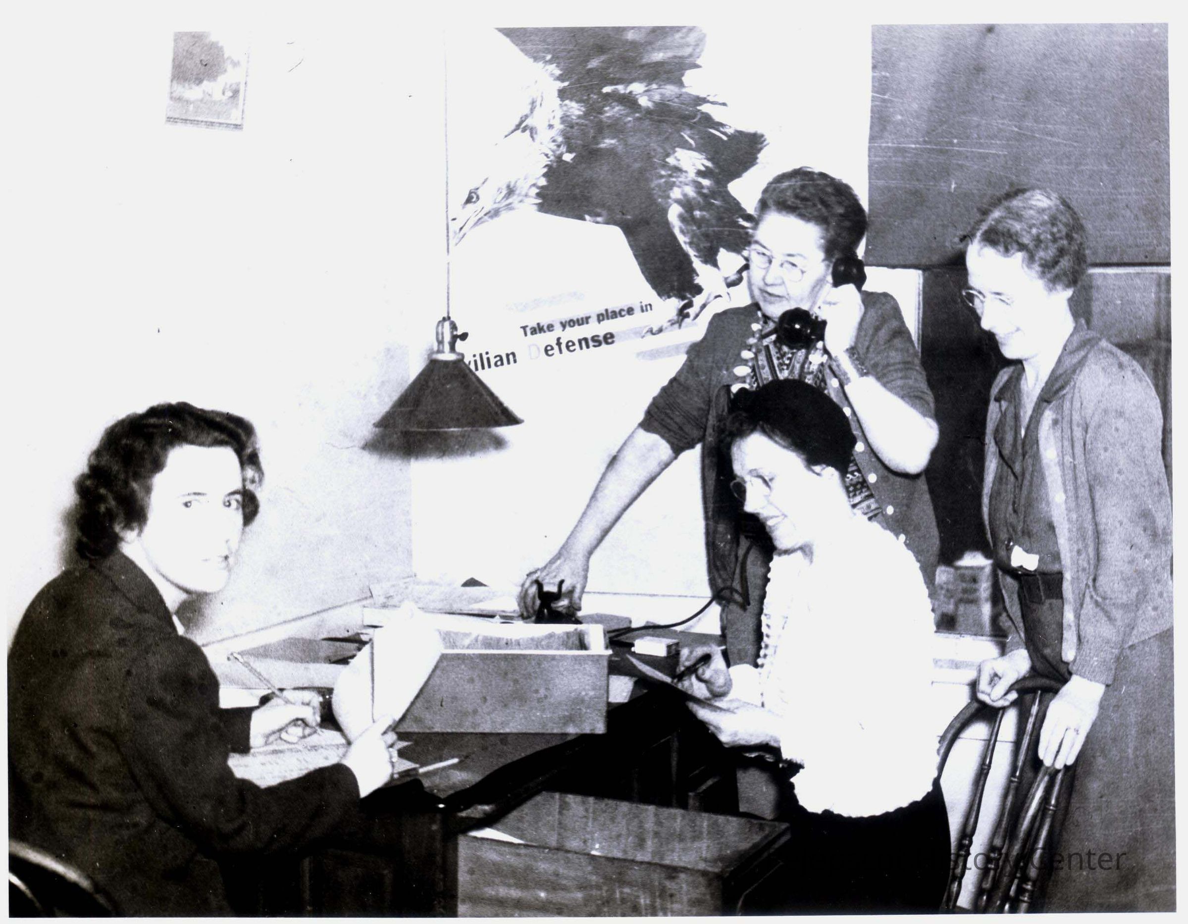 A B/W photograph of four women in an office setting. There is a WWII patriotic poster on the wall. The women are: Susan Chandler at desk, Annie Pletts at desk; Sylvia Nickerson Ouellette(?) with phone; and Susie Sylvester. Undated