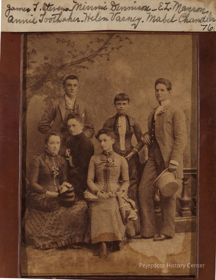 An undated black and white photograph labeled with the names James T. Stevens, Minnie Dennison, and E. L. Manson (probably back row); and Annie Toothaker, Helen Varney, and Mabel Chandler, and the number "76."Collection