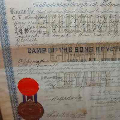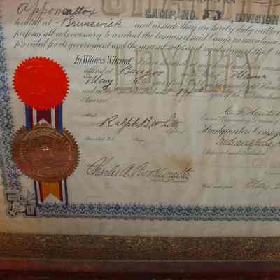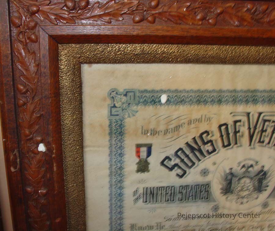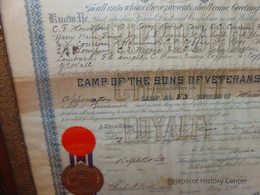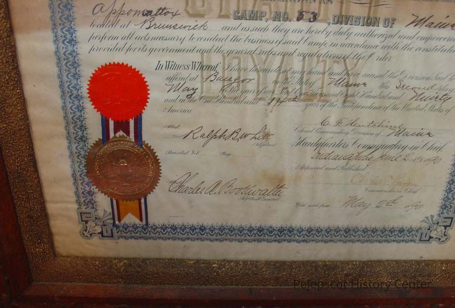 A framed certificate for the founding of the Sons of Veterans in Brunswick. It was to be known as Appomattox Camp Number 53, Division of Maine, located at Brunswick. 05/02/1890
