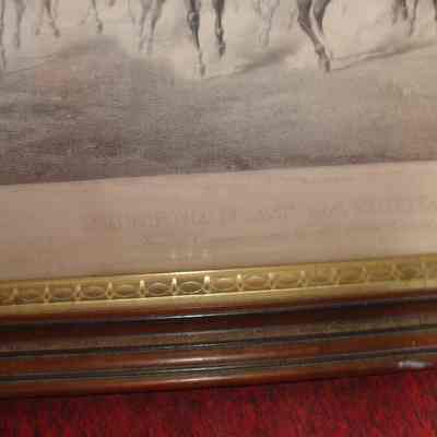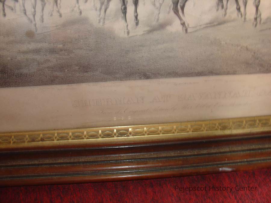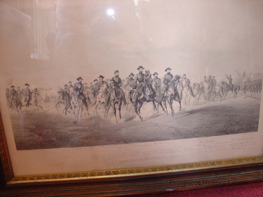 A framed print of General Sherman at Savannah, Georgia. It shows the General with a great many officers. In the lower right corner is a copy of a note he sent to Lincoln. Undated