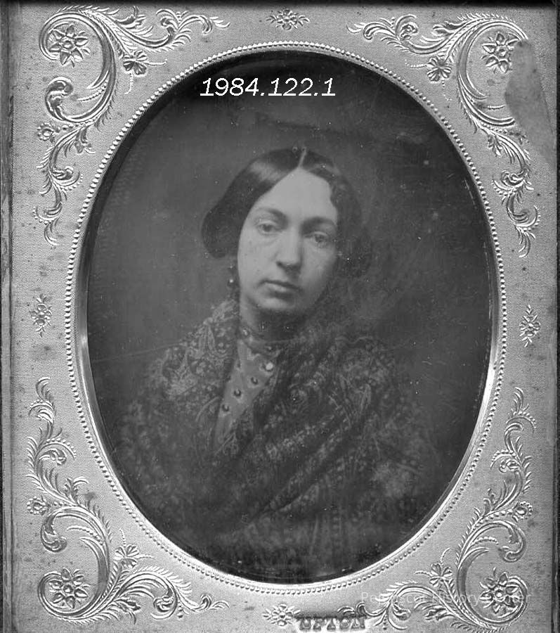 A daguerreotype portrait of Frances Caroline Adams. In frame marked "Upton", in leather and velvet case with detached cover. Undated.