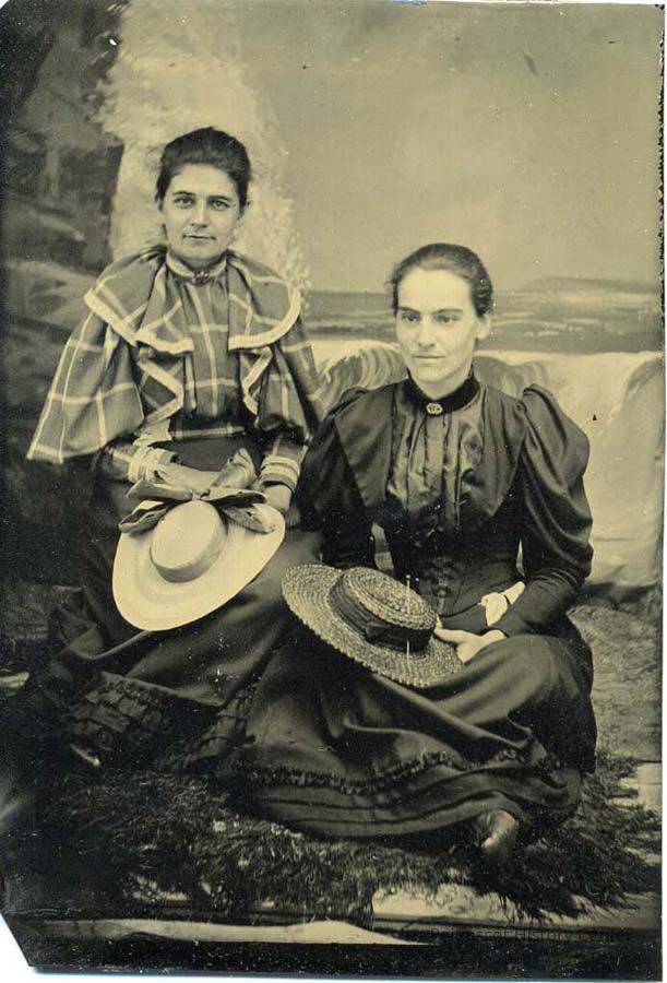 A black and white tin type of Frances M. Woodside (left) & Nellie A. Peterson (right), each holding hats. An ocean backdrop is visible in the background. Undated.