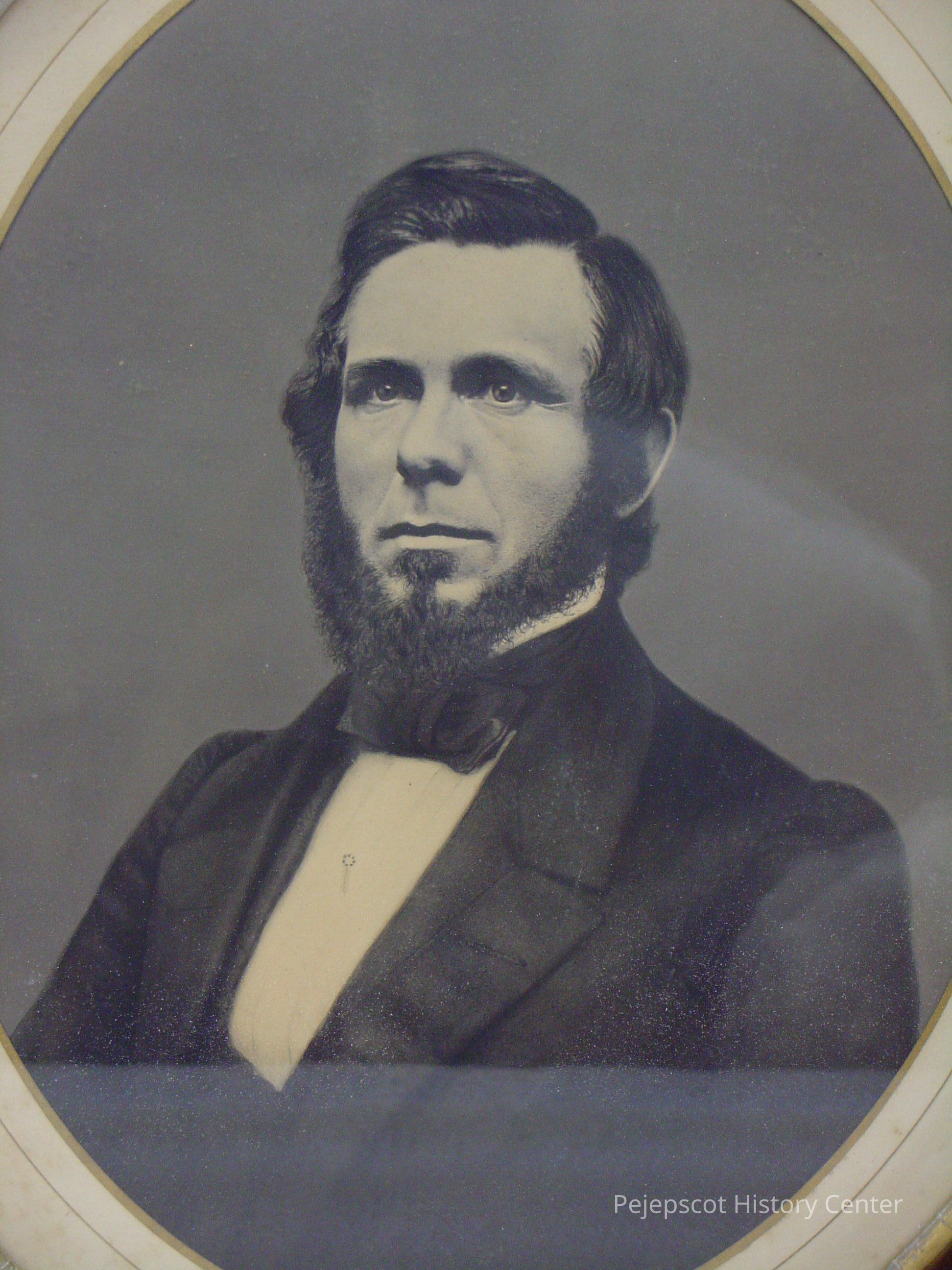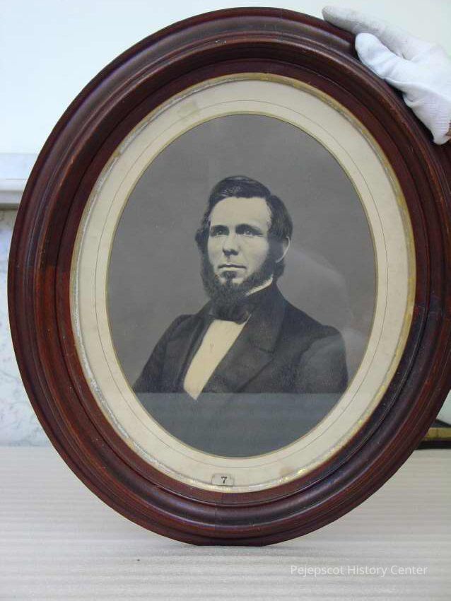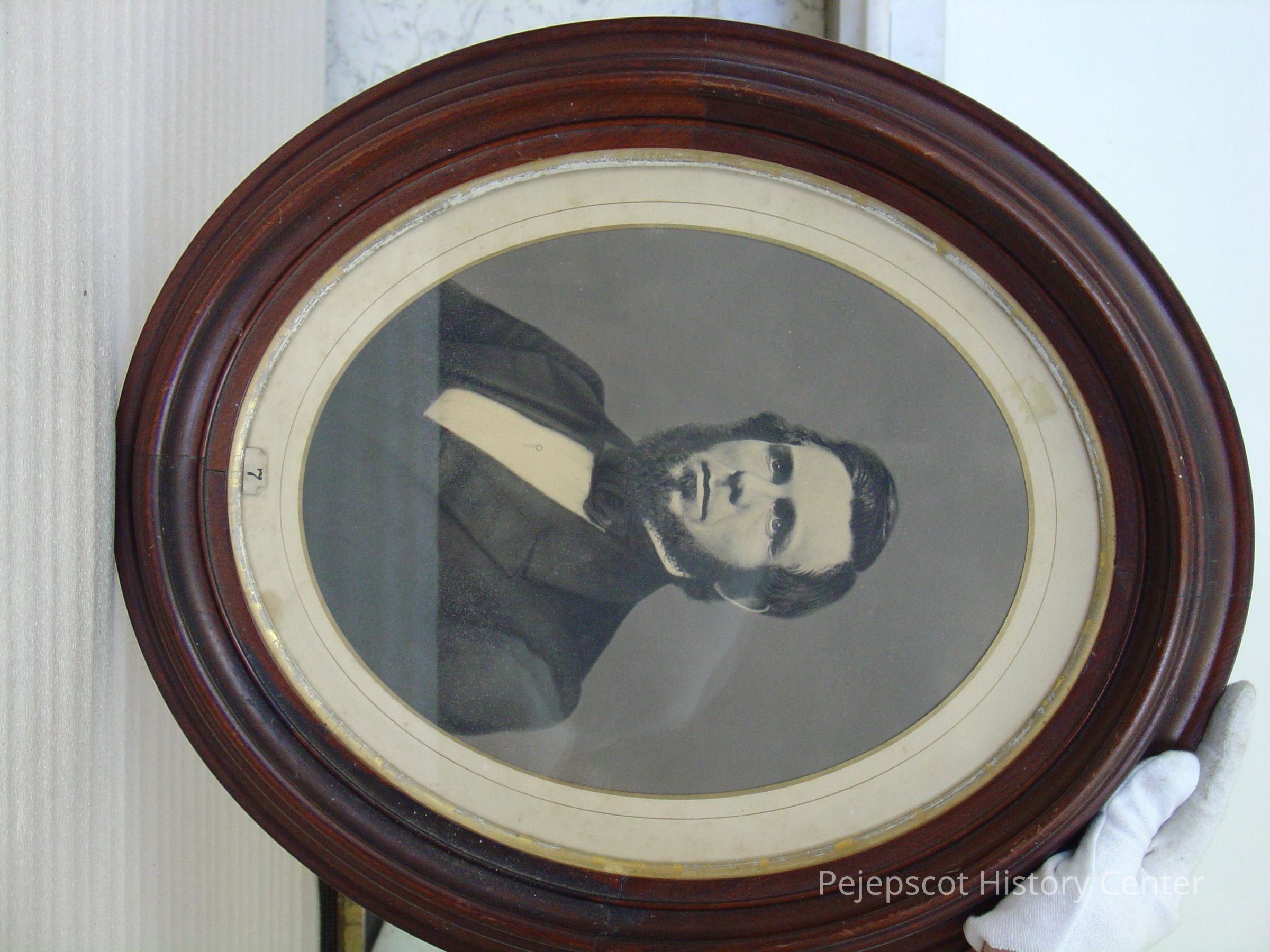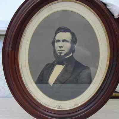 Matted, oval framed B&W photo of Francis Given. The outer frame of the double frame is wood, the inner, narrow gilt molded plaster. Overall size 51.75 cm h x 44. 25 cm w x 4.25 cm d. Not dated.