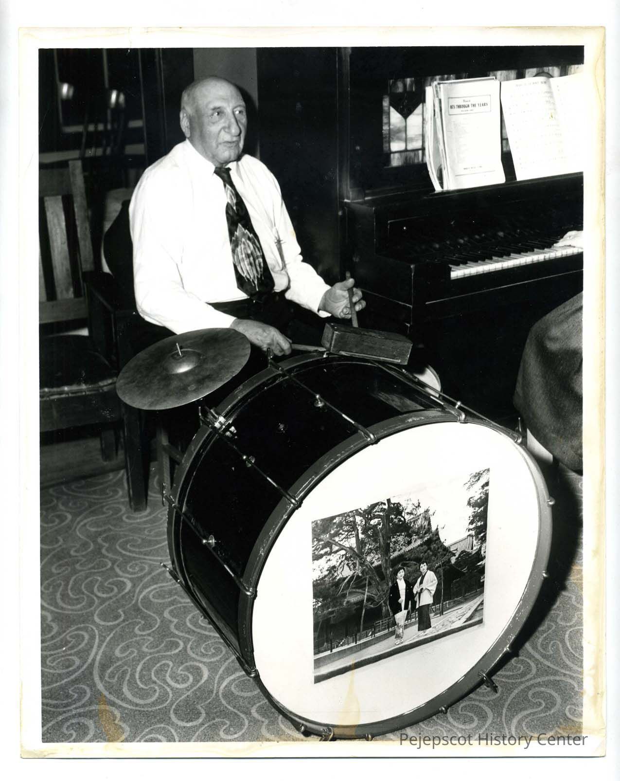 Frank Carver sits at his drums ready to play. There is a piano next to him. Frank had a band and played for Saturday night dances at the Topsham Grange. Undated