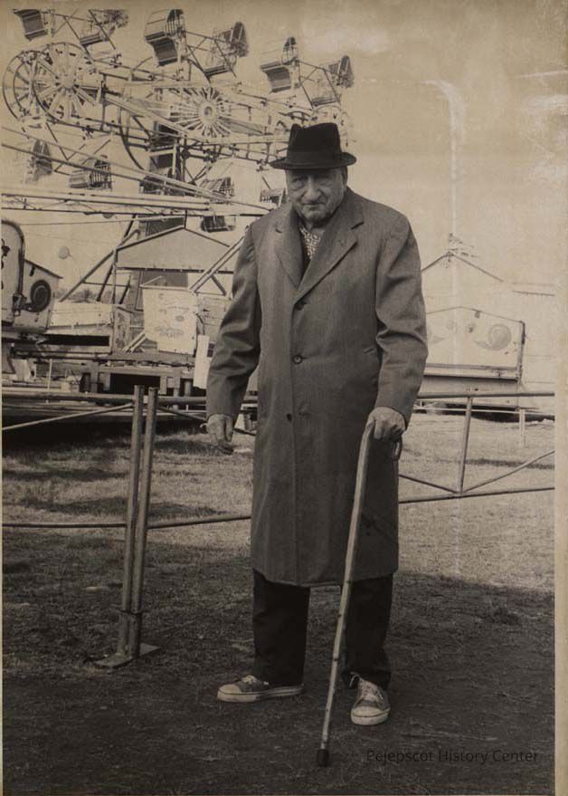 A black and white photo of Frank Carver, who was Topsham police chief from 1928 to 1964, visiting the Topsham Fair Grounds. in October 1977.