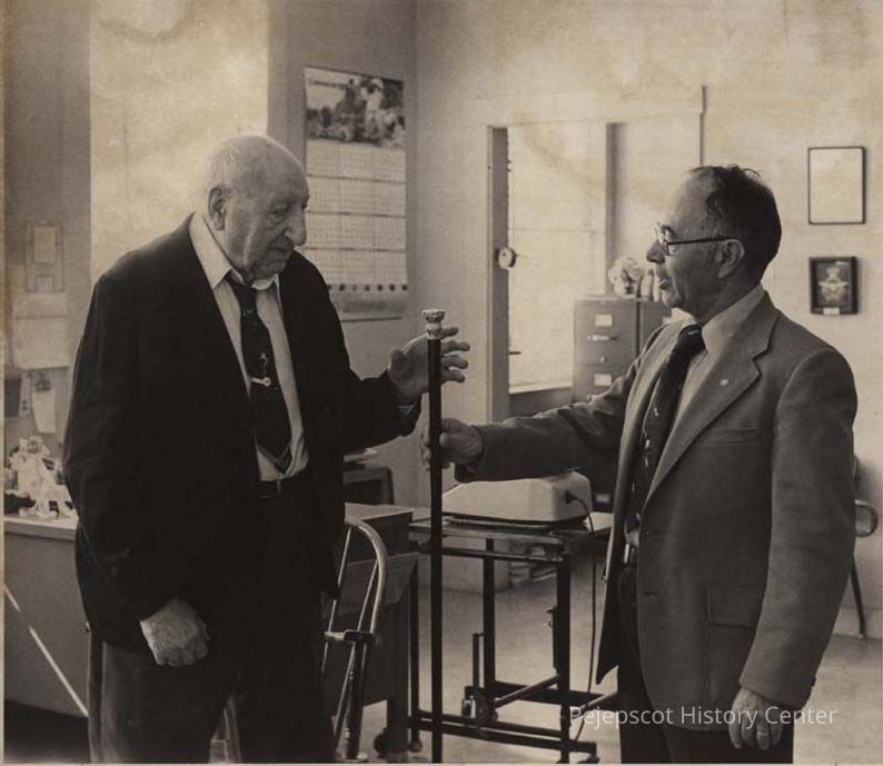 Topsham, Maine, selectman William E. Grieg presented the Boston Post Cane to96-year-old Frank Carver. The cane goes to the town's oldest resident.