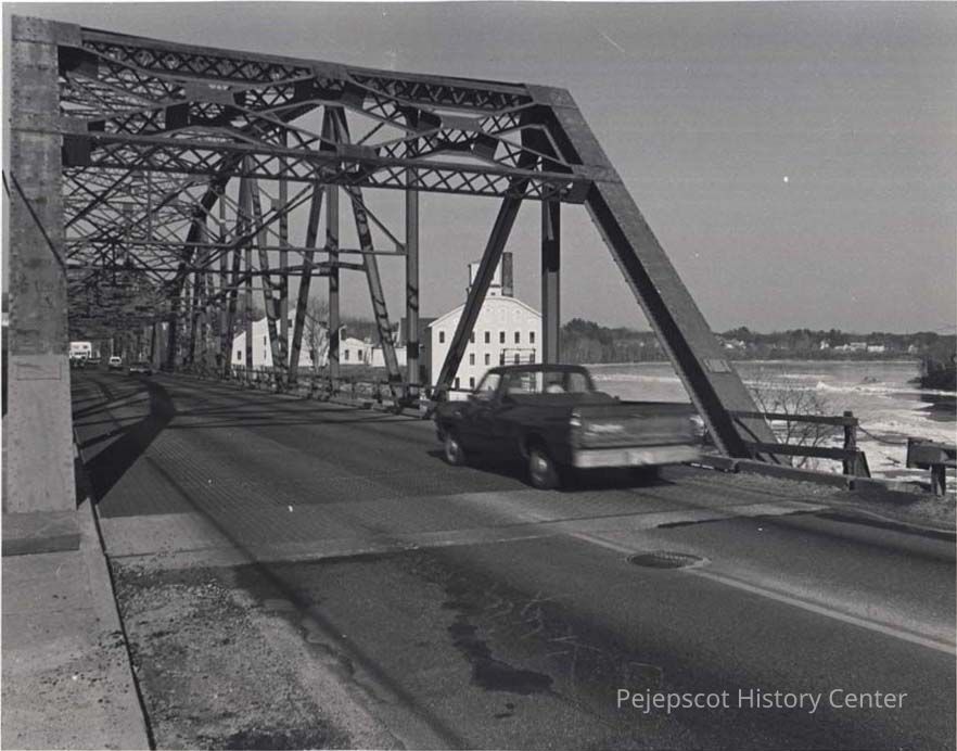 A B/W photograph of the Frank J. Wood Bridge with the Bowdoin Mill in the background. Undated