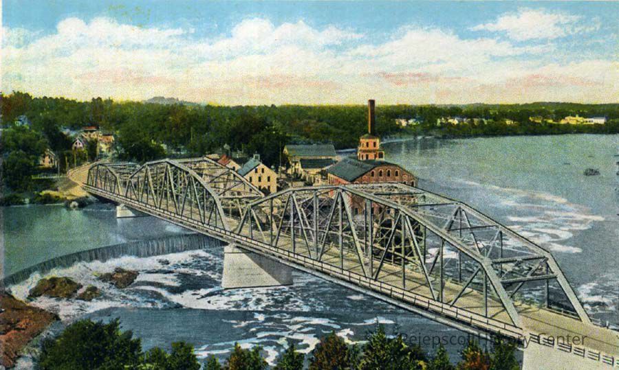 Color postcard of the Frank J. Wood Bridge joining Brunswick and Topsham, ME. The Bowdoin Mill can also be seen. No date.