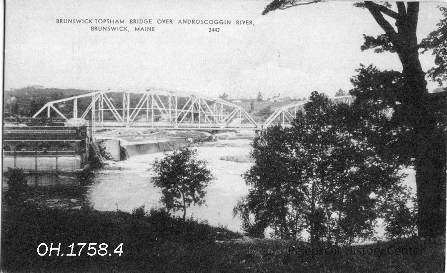 A B/W photograph of the Frank Wood Bridge over the Androscoggin River, Brunswick, ME. The CMPCo generating station can be seen in the lower left. Not dated.