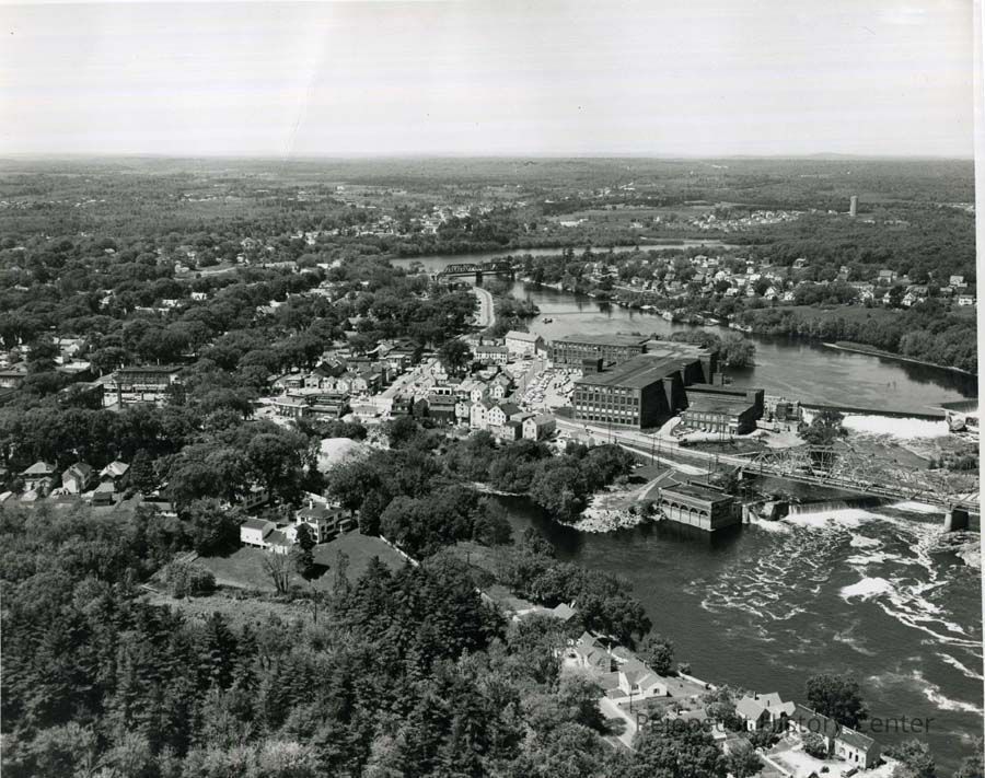 A B/W print aerial view photograph of the Frank J. Wood Bridge, CMP power station and the Androscoggin River, Brunswick, ME. Dated 06/1960.