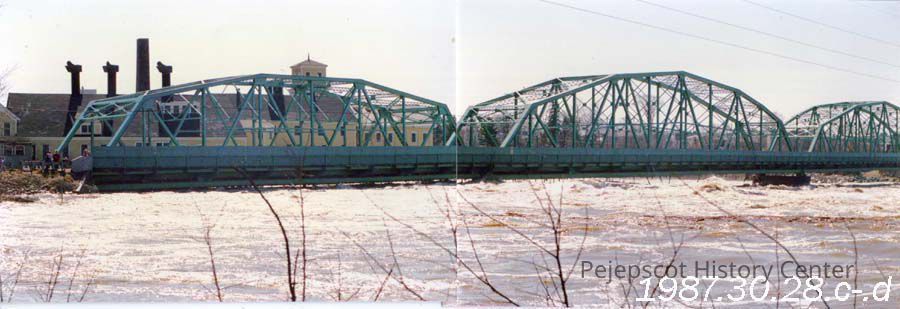 A color photograph of Frank J. Wood Bridge taken from the Topsham, Maine side during the Flood of 1987. This is two photos " photoshopped" together.