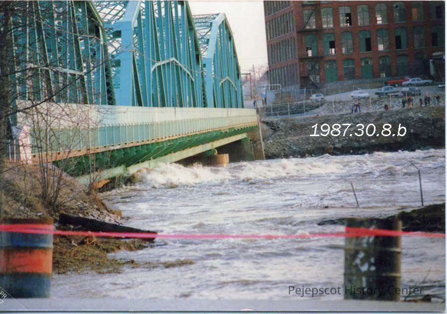A color photograph of the Frank J. Wood Bridge taken from Summer St. Topsham, Maine side looking towards Brunswick April 2, 1987.