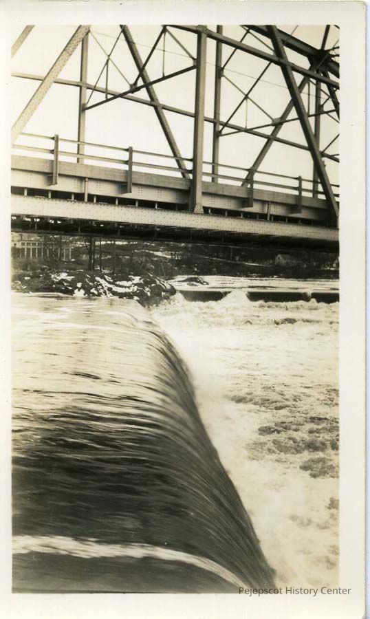 A black and white photo of the Frank J. Wood Bridge during the 1936 flood. Brunswick, Maine