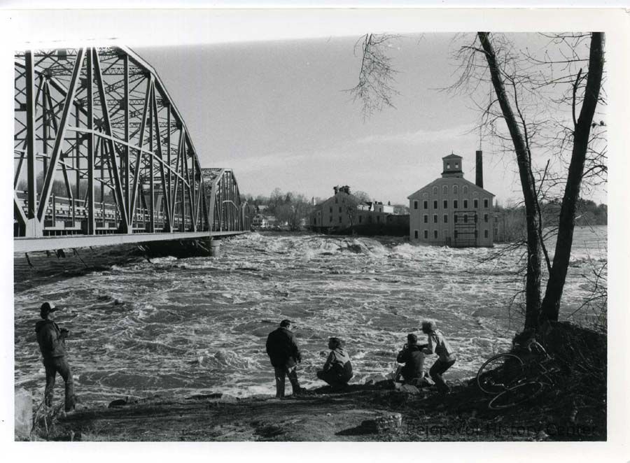 A black and white photograph of the Frank J. Wood Bridge in Brunswick during the flood of April 1, 1987.