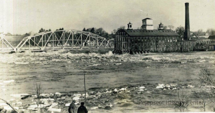 A B/W photo of Pejepscot Paper Mill (Bowdoin Mill, Topsham, ME) and the Frank J. Wood Bridge during a flood on the Androscoggin River. Taken from Brunswick, ME. Photo dated 1936.