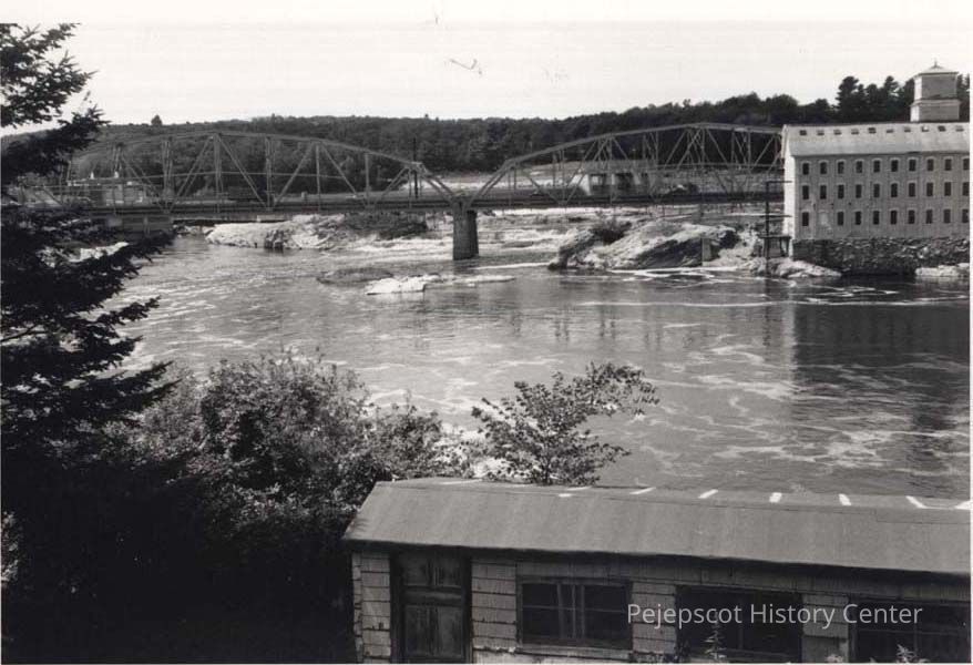 A B/W photograph of the Frank J. Wood Bridge and the Bowdoin Mill. 07/06/1986