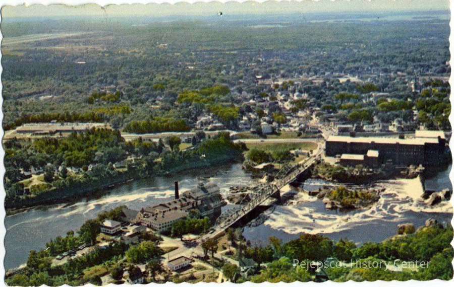 A color picture postcard shows an aerial view of the Frank J. Wood Bridge looking from Topsham to Brunswick. The card is dated 8/14/1970. It has scalloped edges.Collection