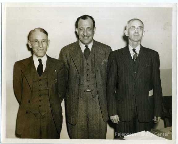 Three men standing, dressed in suits. Frank Morin, Dave Simon, Fred Harmon. UndatedCollection