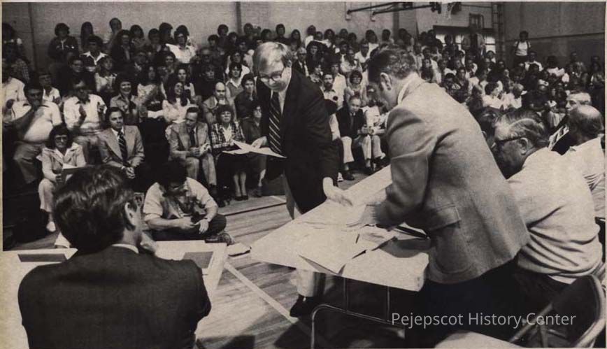A black and white photo of Frank R. Goodwin presenting a petition to the Brunswick School Board was published in The Times Record in Brunswick, Maine, on 6/15/1981.