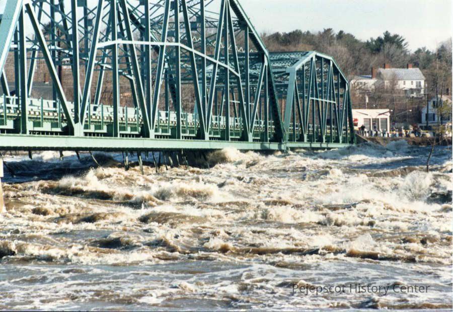 A color photo of the Frank Wood Bridge between Topsham and Brunswick (taken from the Brunswick, Maine side) during the April 1987 flood.
