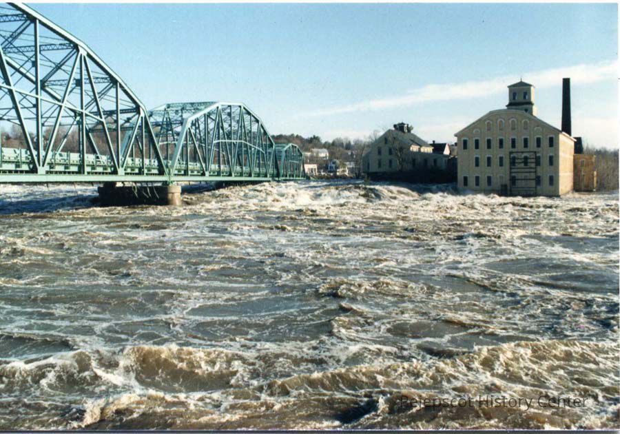 Floods - 1987, Floods - Brunswick, Pejepscot Paper Co. Mill, Pejepscot Paper Mill, Bridges - Frank J. Wood Bridge