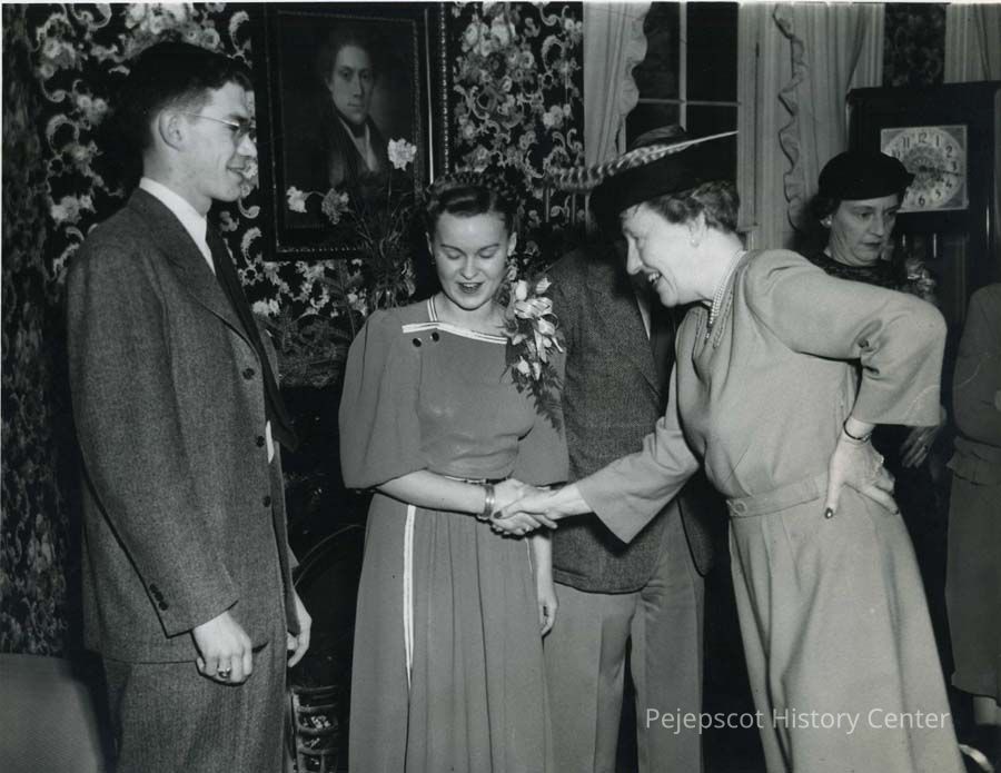 A B/W photograph of the Franklyn and Susan White Crouch reception. Emily Baxter Holmes with hand on hip. Undated