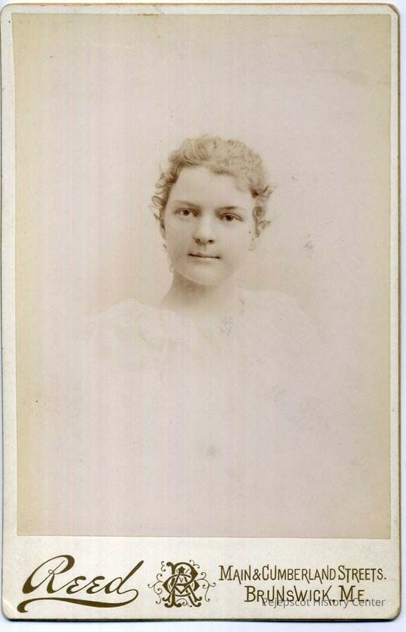 A black and white graduation photograph of Frannie (? - first name difficult to read) Sawyer, Class of 1893, Brunswick High School. The photograph is one of 25 taken by A. O. Reed, photographer, Brunswick, Maine. On the back of the photograph is the photographer's logo and the wording "All kinds of portraiture in Crayon, Ink or Water Color." On the bottom front of the photo is the address for the photographer, Main and Cumberland Streets, Brunswick, Maine.Lexicon