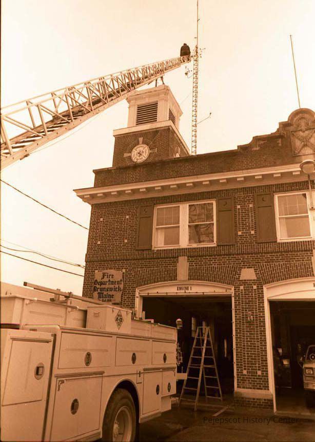 An undated black and white photograph of the Brunswick, Maine, Fire Department putting up holiday decorations.Collection