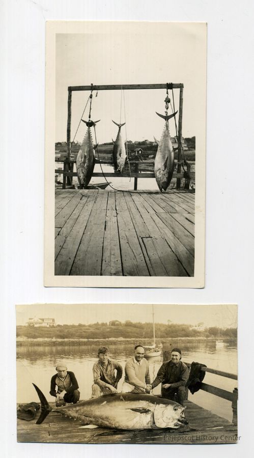 Two photos of men with freshly caught tuna, probably at a Bailey Island wharf.