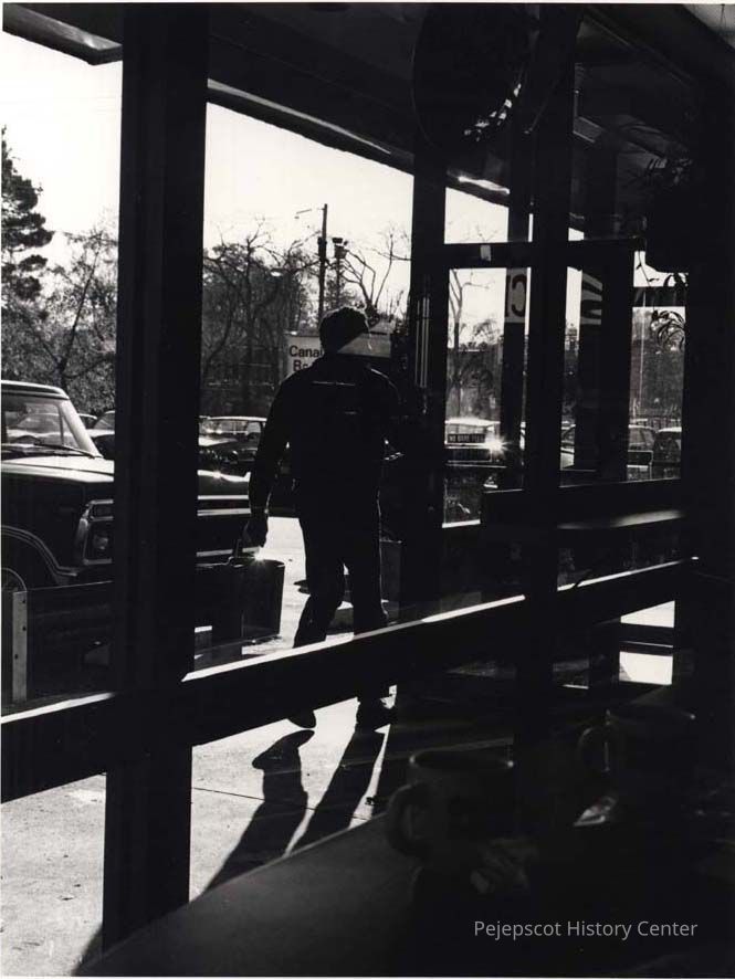 A B/W photograph of the front entrance to the Dunkin Donuts on Maine Street taken from the inside looking out. Undated
