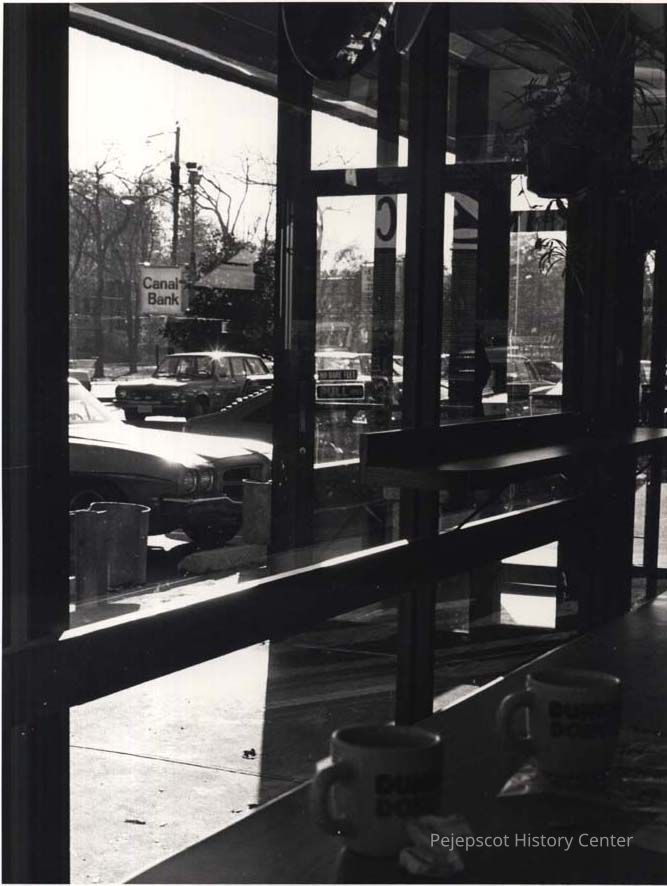 A B/W photograph of the front entrance to the Dunkin Donuts on Maine Street taken from the inside looking out. Undated