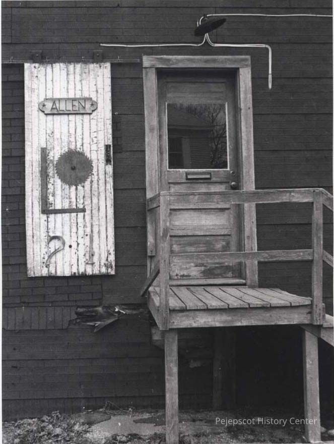 A B/W photograph of the front of Allen's woodworking shop on Hennessey Avenue. Undated