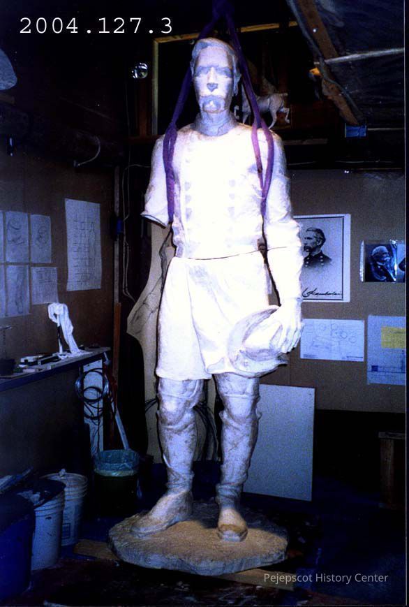 A color photograph of the full size clay model of the J.L. Chamberlain statue.