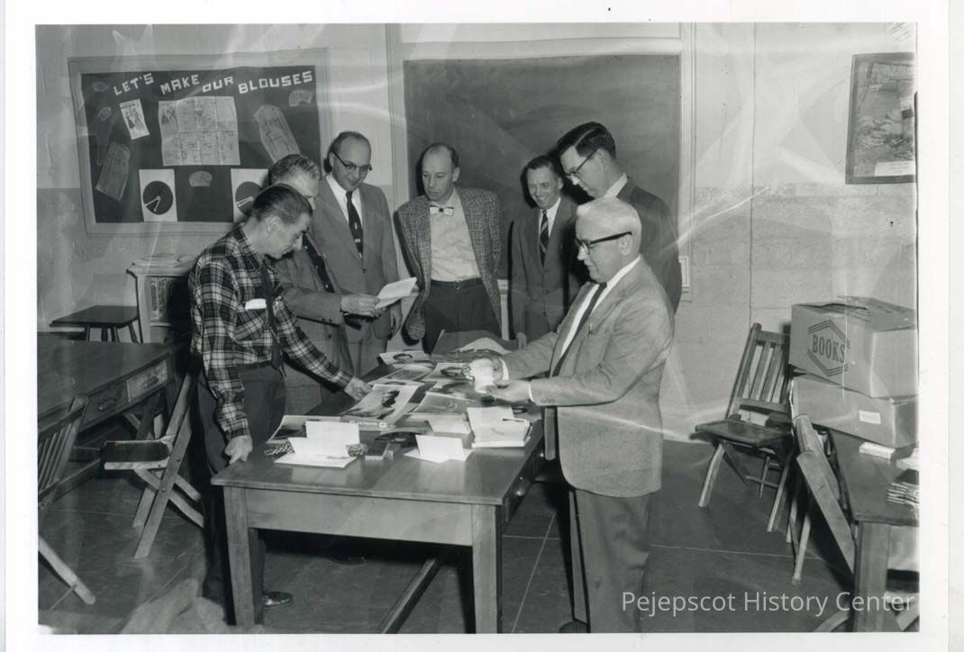 Members of the fund raising committee of the Brunswick Area Student Aid Fund examine articles sent by motion picture stars for their auction. They include a necktie from Eddie Cantor, recordings from Eddie Fisher and Perry Como, a wallet from Bing Crosby, handkerchiefs and pictures. Phil Moreau, at right, is holding a shaving mug donated by John Wayne. Left to right are Phil Theberge, Brice Booker,Mario Tonon, David Dyer, Lionel Lavigne, Leroy Nielson, and Phil Moreau.Lexicon