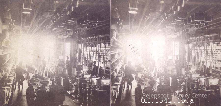 A B/W stereo view of the interior of Furbish Hardware, Brunswick, ME. Undated