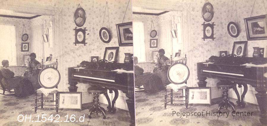 A stereo view of the parlor at the Furbish house on 10 Cumberland Street, Brunswick, ME. Undated