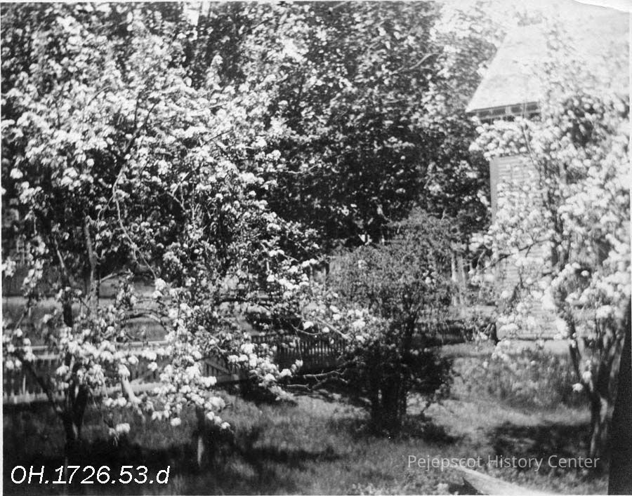 A B/W photograph of the pear tree in the yard of the Furbish House, Brunswick, ME. Photo not dated.